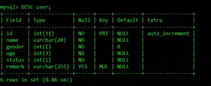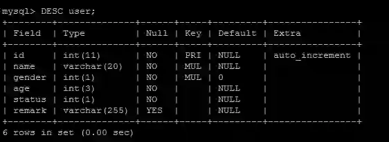 此部分用于测试的user表结构: