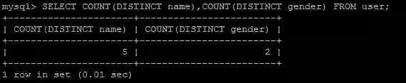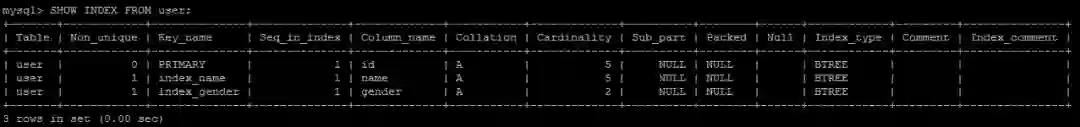 user表的总行数是5,gender列的基数是2,说明gender列里面有大量重复值,name列的基数等于总行数,说明name列没有重复值,相当于主键。
