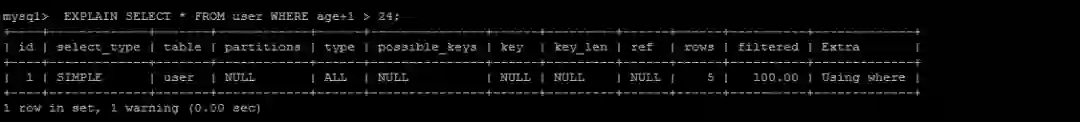 EXPLAIN SELECT * FROM user WHERE age+1>24;
