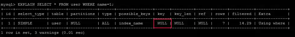 EXPLAIN SELECT * FROM user WHERE name=1;
