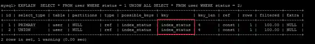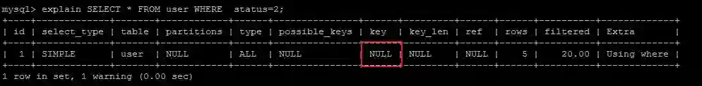 EXPLAIN SELECT * FROM user WHERE status=2 ;