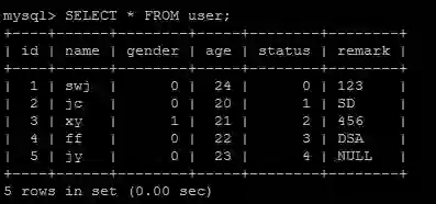 user表中共有5条数据: