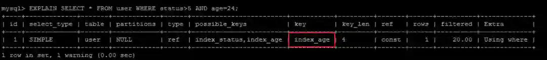 EXPLAIN SELECT * FROM user WHERE status>5 AND age=24;