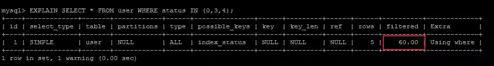 EXPLAIN SELECT * FROM user WHERE status IN (0,3,4);
