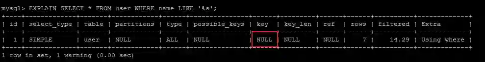 EXPLAIN SELECT * FROM user WHERE name LIKE '%s%';