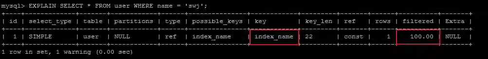 SELECT * FROM user WHERE name = 'swj';命中了索引index_name,因为走索引直接就能找到要查询的记录,所以filtered的值为100。
