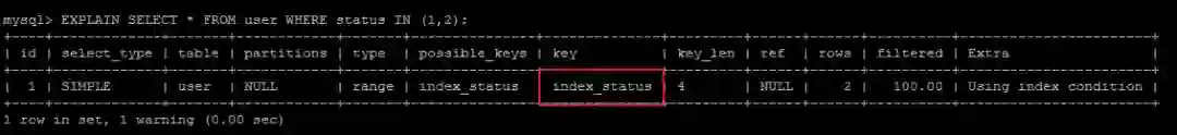 EXPLAIN SELECT * FROM user WHERE status IN (1,2);