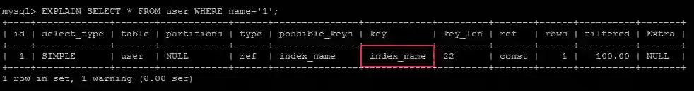 EXPLAIN SELECT * FROM user WHERE name='1';