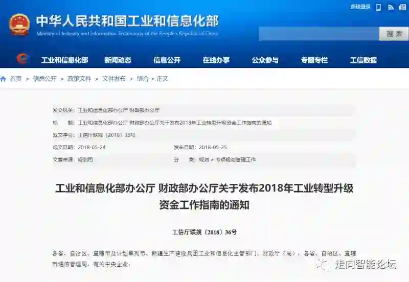 为加快制造强国和网络强国建设,促进工业转型升级,工业和信息化部、财政部日前联合发布《2018年工业转型升级资金工作指南》,组织开展相关工作。包括工业强基工程实施方案、绿色制造系统集成、工业互联网创新发展工程及智能制造综合标准化与新模式应用、首台(套)重大技术装备保险补偿等四个重点方向。本文来自:工信微报,由《走向智能论坛》公号推荐阅读。