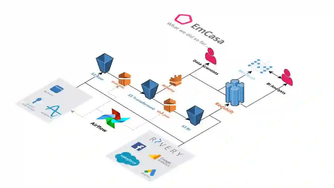 当我收到 EmCasa 公司的面试邀约的时候,我是另外一家公司的数据科学家。他们想找一位可以帮助他们组织数据的人。我问他们现在已经有哪些数据了,他们真诚地回答我:“我们只有 PostgreSQL 数据库里的几张表,还尝试使用了一些 BI 工具,仅此而已”。听了他们的话,我也很诚实地告诉他们:我没有亮眼的学位,之前也没做过数据工程师,不懂 Spark,不会 Airflow,不是 ETL 方面的专家,也不懂测试和 Git 之类的东西,我也不是一名开发人员。但我见过很多东西,有一些很好,有一些还不错但仍有提升的空间,还有一些完全不行。我的想法是要尽量避免去尝试已知不可行的东西。