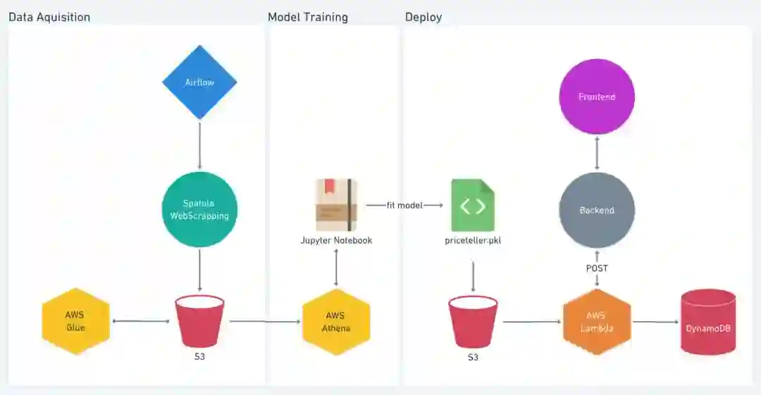 下一步是改进物业估价模型,并将其作为一个独立的 API(之前的模型是与后端绑定在一起的)。但我们没有足够的数据来创建新模型(虽然确实有了一些数据,但还不够)。于是,我把目光投向了我们的 Web 爬虫工具。它是用 Elixir(我们的后端就是用 Elixir 开发的)开发的,但我不懂 Elixir,于是我决定用 Python 从头开始开发另一个爬虫。我创建了一个叫作 Spatula 的 Python 包,它可以从其他网站爬取数据清单,并将它们保存到 S3。这个时候,我们的数据科学家 Priscila 也加入进来,她负责处理旧数据。我在本地运行 Spatula,她就可以使用 Athena 查询数据,然后开始建模。