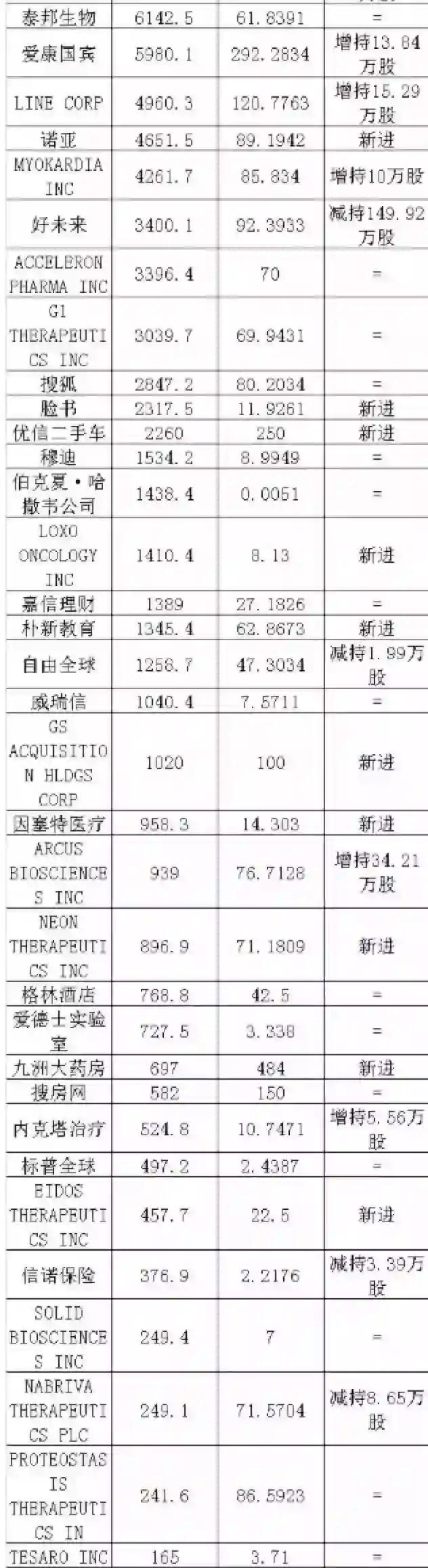 不过在二季度时也退出了包括新浪、哔哩哔哩等6家个股,一季度末时,数据显示其持有新浪、哔哩哔哩、TIGENIX、SEA LTD、特许通讯公司、百胜中国,分别持有165.32万股,105.49万股、48.39万股、144.44万股、1.75万股、6.97万股。而这6家企业数据均未出现在其最新持仓列表中。