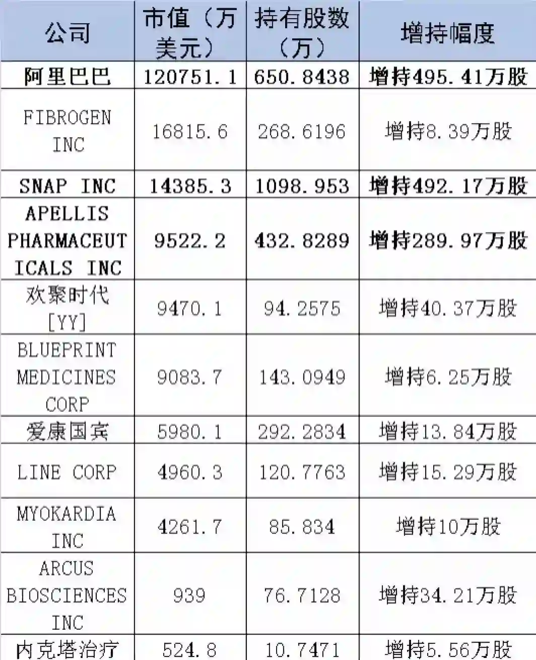 包括阿里巴巴在内的11家增持个股中,增持幅度比较大的还有SNAP INC和APELLIS PHARMACEUTICALS INC,增持股数都超200万股。