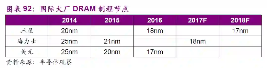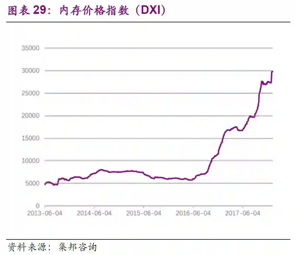 供给端:DRAM主要掌握在三星、海力士、美光等几家手中,呈现寡头垄断格局,三星市占率约为45%。2016年Q3之前,DRAM价格一路走低,所有DRAM厂商都不敢贸然扩产。供不应求导致DRAM价格从2016年Q2/Q3开始一路飙升,DXI指数从6000点上涨到如今的30000点。DXI指数是集邦咨询于2013年创建反映主流DRAM价格的指数。