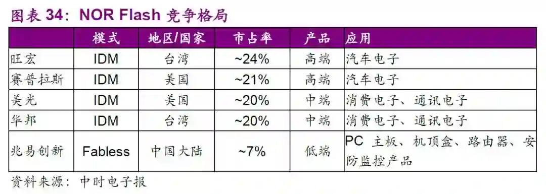 经过近几年版图大洗牌,目前旺宏成为产业龙头,市占率约24%,CYPRESS(赛普拉斯)市场占有率约21%,美光科技市占率约20%,华邦电居第四位,大陆厂商兆易创新居第五,占有一席之地。从各家公司的产品分布上,最高端NORFLASH产品多由美光、赛普拉斯供应,应用领域以汽车电子居多;华邦、旺宏则以NORFLASH中端产品供应为主,应用领域以消费电子、通讯电子居多;而兆易创新提供的多为低端产品,主要应用在PC主板、机顶盒、路由器、安防监控产品等领域。