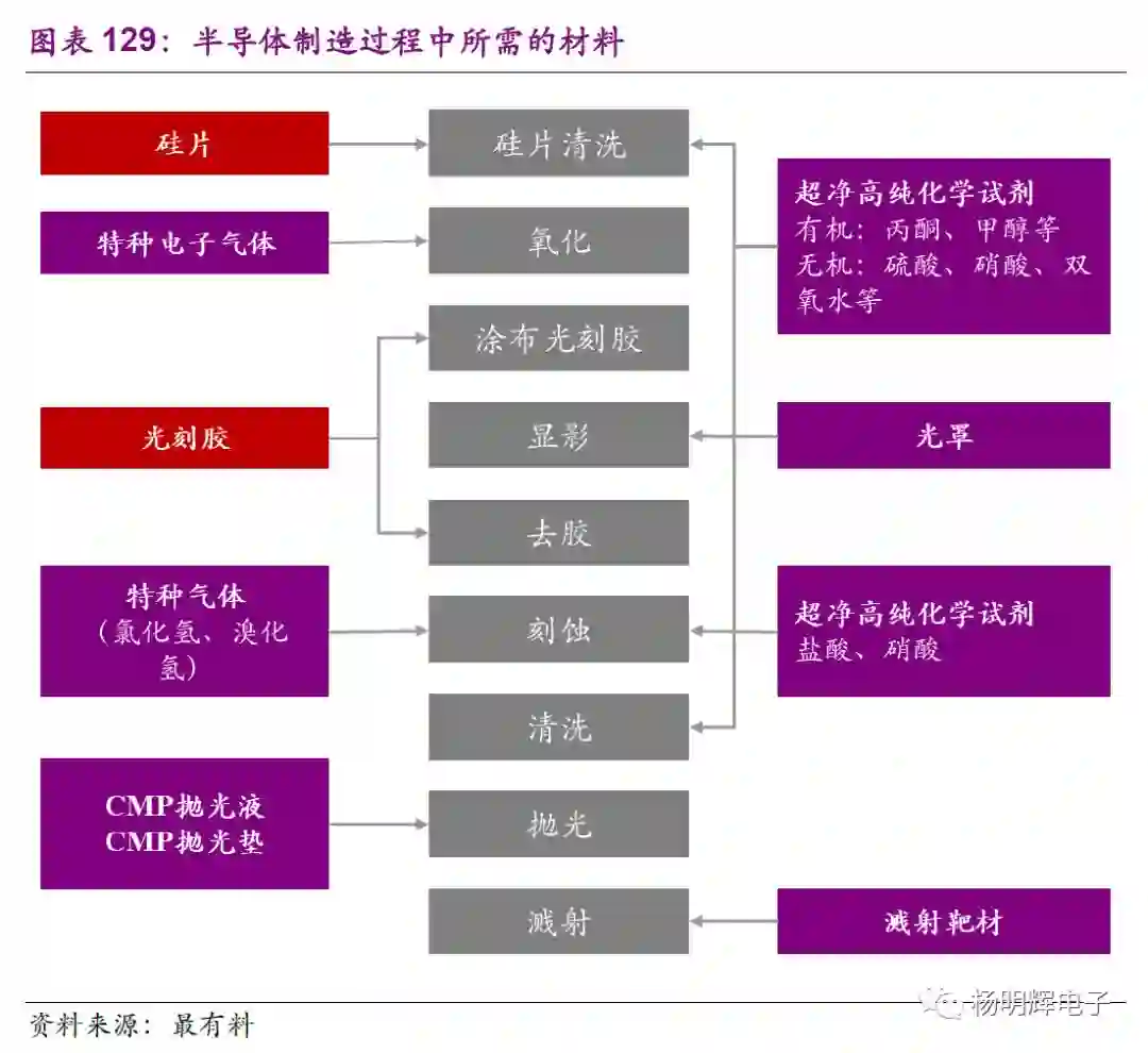 集成电路制造过程中,每一个环节都离不开化学材料,按产业链工艺环节可以将半导体材料分为晶圆制造材料和封装材料。