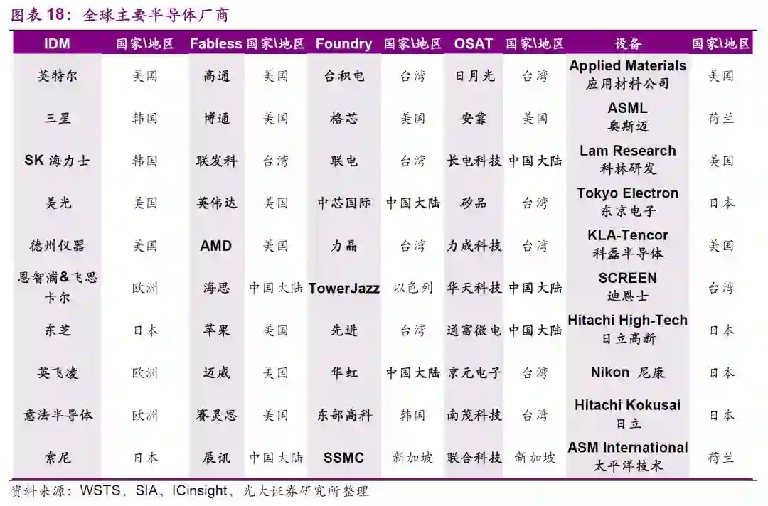 1990s,随着PC兴起,存储产业从美国转向日本后又开始转向了韩国,孕育出三星、海力士等厂商。同时,台湾积体电路公司成立后,开启了晶圆代工(Foundry)模式,解决了要想设计芯片必须巨额投资晶圆制造产线的问题,拉开了垂直代工的序幕,无产线的设计公司(Fabless)纷纷成立,传统IDM厂商英特尔、三星等纷纷加入晶圆代工行列,垂直分工模式逐渐成为主流,形成设计(Fabless)→制造(Foundry)→封测(OSAT)三大环节。