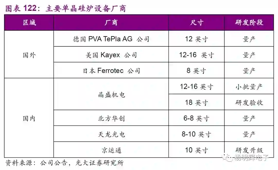 晶盛机电在半导体级8英寸单晶炉领域已成功实现进口替代。捷佳伟创、北京京运通、天通吉成的产品主要应用于光伏产业。