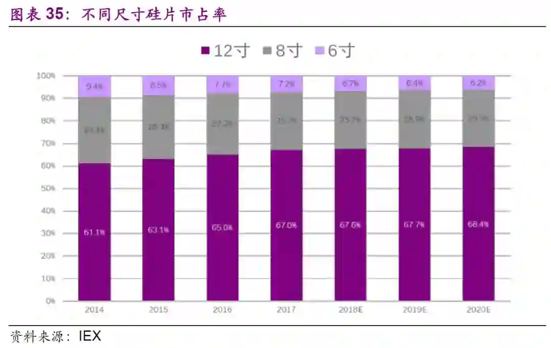 目前主流的硅片为300mm(12英寸)、200mm(8英寸)和150mm(6英寸),其中12英寸硅片份额在65-70%左右,8寸硅片占25-27%左右,6寸占6-7%左右。近年来12英寸硅片占比逐渐提升,6和8寸硅片的市场将被逐步挤压,预计2020年二者合计占比由2014年的40%左右下降到2020年的30%左右,而更大尺寸450mm(18英寸)产能将在19年开始逐步投建。