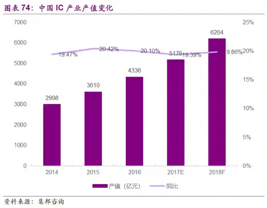 经过多年的发展,国内半导体生态逐渐建成,设计制造封测三业发展日趋均衡。设计业:虽然收购受限,但自主发展迅速,群雄并起,海思展讯进入全球前十。制造业:晶圆制造产业向大陆转移,大陆12寸晶圆厂产能爆发。代工方面,虽然与国际巨头相比,追赶仍需较长时间,但中芯国际28nm制程已突破,14nm加快研发中;存储方面,长江存储、晋华集成、合肥长鑫三大存储项目稳步推进。封测业:国内封测三强进入第一梯队,抢先布局先进封装。设备:国产半导体设备销售快速稳步增长,多种产品实现从无到有的突破,星星之火等待燎原。材料:国内厂商在小尺寸硅片、光刻胶、CMP材料、溅射靶材等领域已初有成效;大尺寸硅片国产化指日可待。