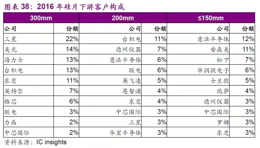 硅片的下游客户主要以三星、美光、SK海力士、东芝/WD为代表的存储芯片制造商和以台积电、格罗方德、联电、力晶科技、中芯国际为代表的纯晶圆代工业者。