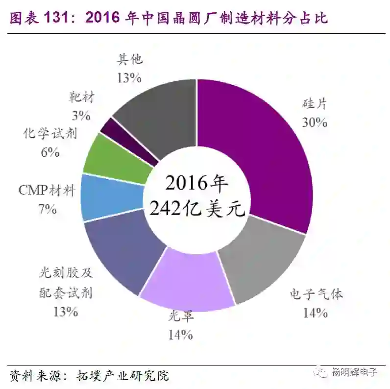 近年随着出货片数成长,中国半导体制造材料营收也由2013年230亿美元成长到2016年的242亿美元,年复合成长率约1.8%。从细项中可看出硅晶圆销售占比由2013年35%降到2016年的30%。根据拓墣产业研究院预计,2017年中国半导体材料市场,增长幅度将超过10%。