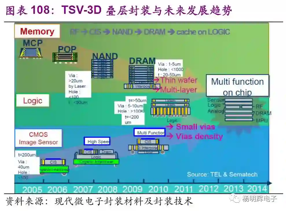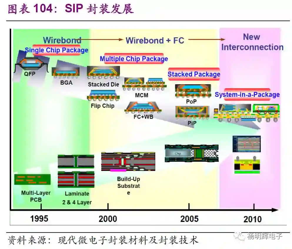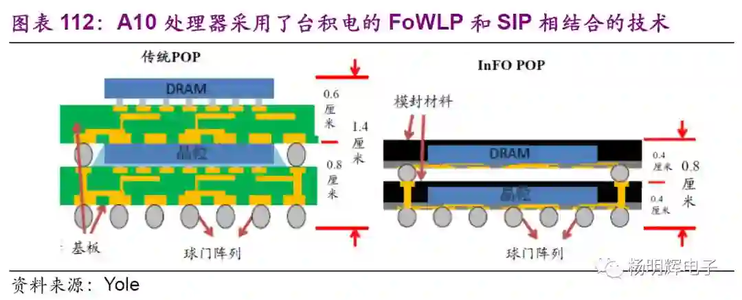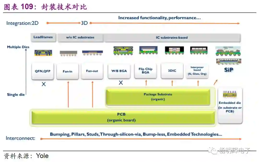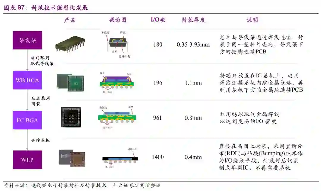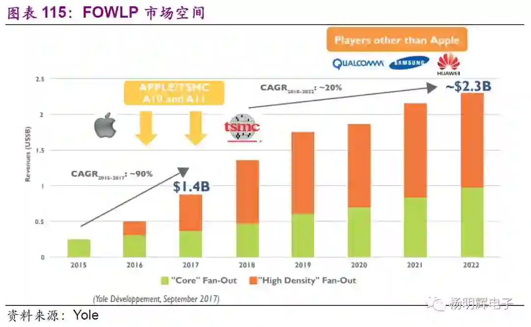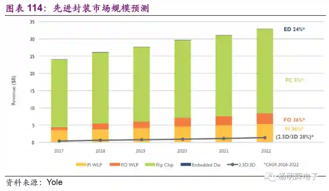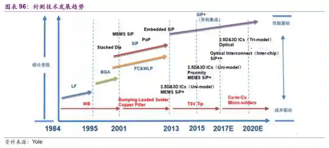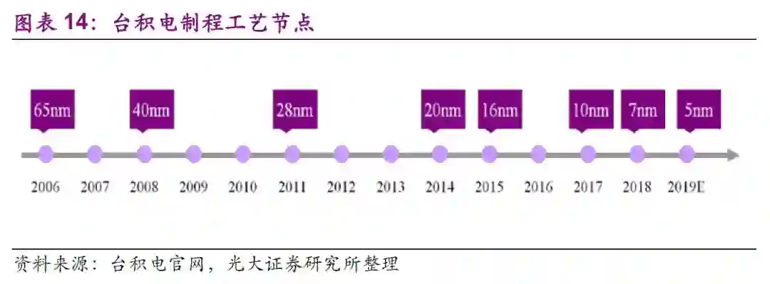 以台积电为例,晶圆制造的制程每隔几年便会更新换代一次。近几年来换代周期缩短,台积电2017年10nm已经量产,7nm将于今年量产。苹果iPhoneX用的便是台积电10nm工艺。除了晶圆制造技术更新换代外,其下游的封测技术也不断随之发展。