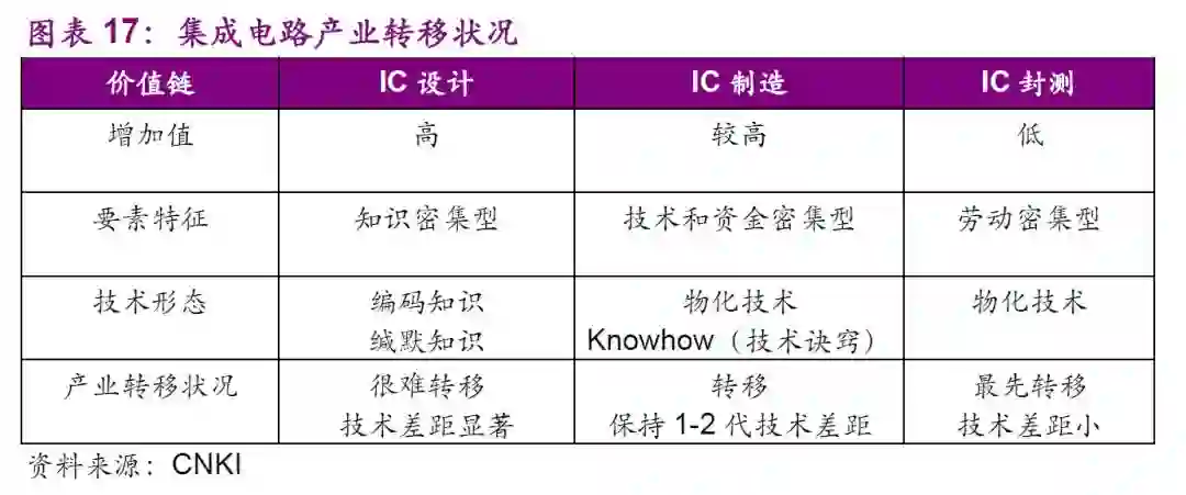 韩国和台湾地区的集成电路产业均从代工开始,代工选择的主要因素便是人力成本,当时韩国和台湾地区的人力成本相比于日本低很多,封测业便开始从日本转移到韩国、台湾地区。同样由于人力成本的优势,在21世纪初,封测业已经向国内转移,可以说已经完成了当年韩国、台湾地区的发展初期阶段。劳动力密集型的IC封测业最先转移;而技术和资金密集型的IC制造业次之,转移后会相差1-2代技术;知识密集型的IC设计一般很难转移,技术差距显著,需要靠自主发展。