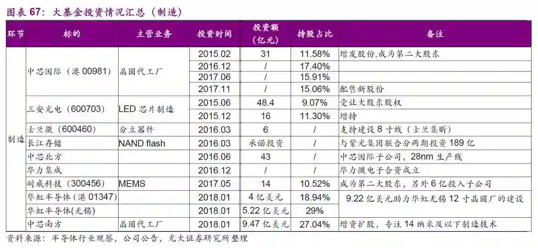 国内半导体市场接近全球的三分之一,但国内半导体自给率水平非常低,特别是核心芯片极度缺乏,国产占有率都几乎为零。芯片关乎到国家安全,国产化迫在眉睫。2014年《国家集成电路产业发展推进纲要》将半导体产业新技术研发提升至国家战略高度。大基金首期投资成果显著,撬动了地方产业基金达5000亿元,目前大基金二期募资已经启动,募集金额将超过一期,推动国内半导体产业发展。