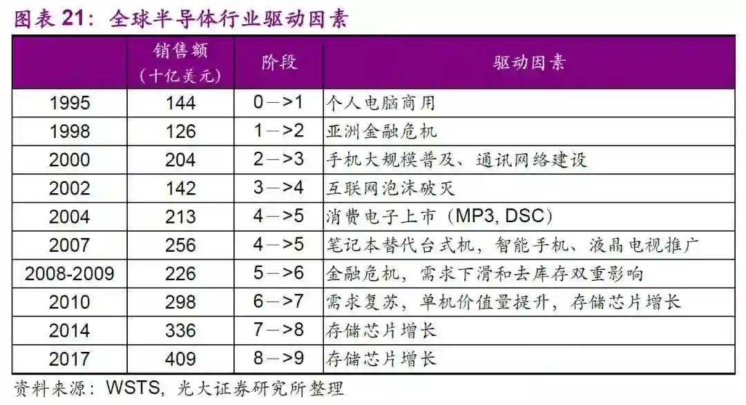 从全球半导体销售额同比增速上看,全球半导体行业大致以4-6年为一个周期,景气周期与宏观经济、下游应用需求以及自身产能库存等因素密切相关。