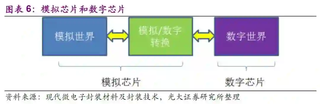 集成电路可分为数字电路、模拟电路。一切的感知:图像,声音,触感,温度,湿度等等都可以归到模拟世界当中。很自然的,工作内容与之相关的芯片被称作模拟芯片。除此之外,一些我们无法感知,但客观存在的模拟信号处理芯片,比如微波,电信号处理芯片等等,也被归类到模拟范畴之中。比较经典的模拟电路有射频芯片、指纹识别芯片以及电源管理芯片等。数字芯片包含微元件(CPU、GPU、MCU、DSP等),存储器(DRAM、NANDFlash、NORFlash)和逻辑IC(手机基带、以太网芯片等)。