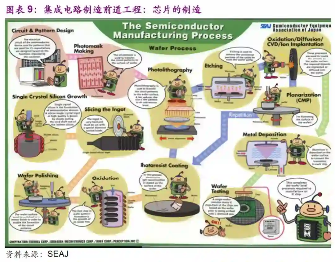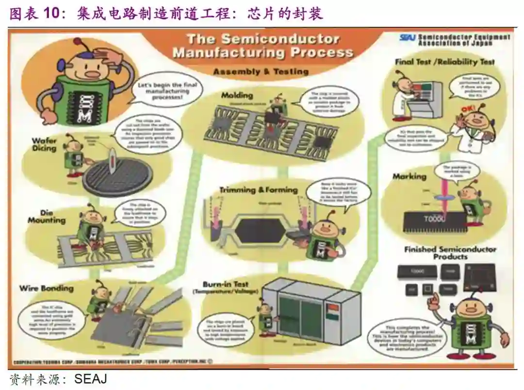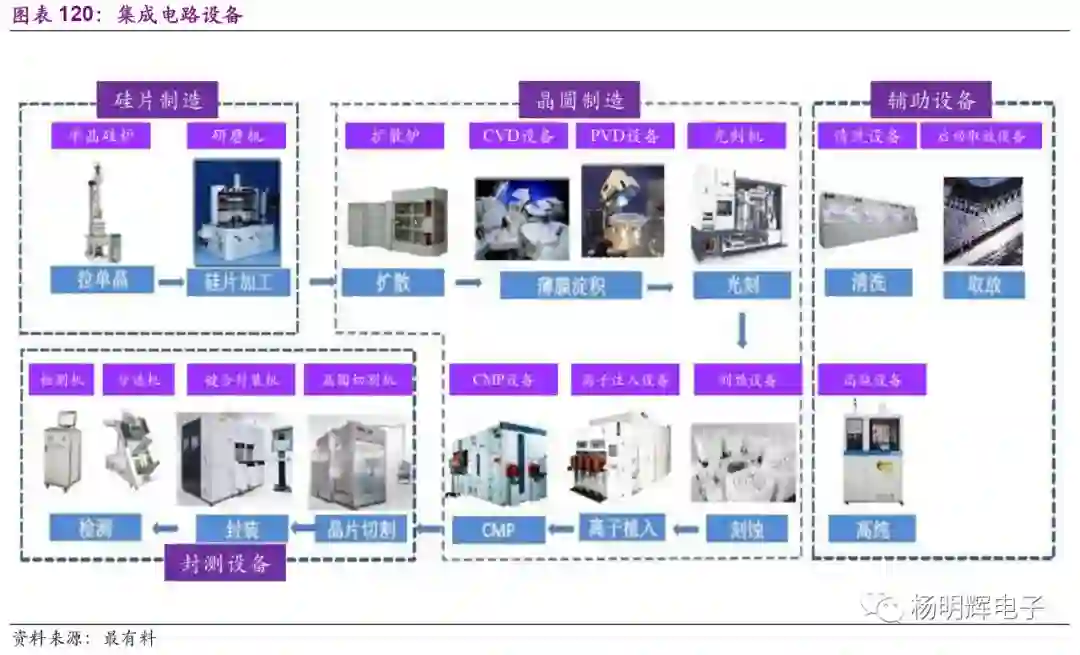 简单的讲,电子制造产业包括:原材料砂子-硅片制造-晶圆制造-封装测试-基板互联-仪器设备组装。集成电路产业链主要为设计、制造、封测以及上游的材料和设备。