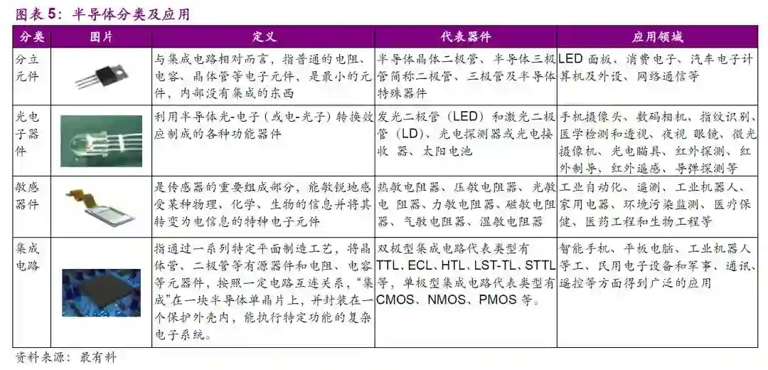 半导体主要分为集成电路和半导体分立器件。半导体分立器件包括半导体二极管、三极管等分立器件以及光电子器件和传感器等。