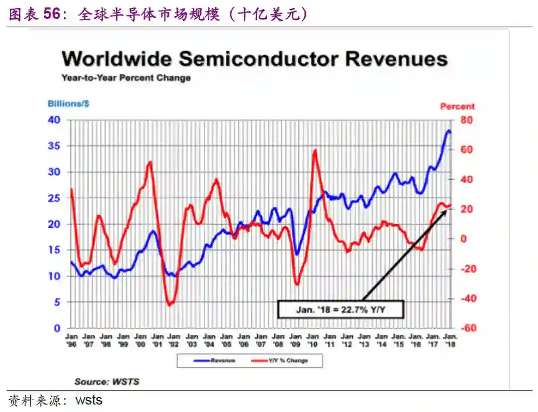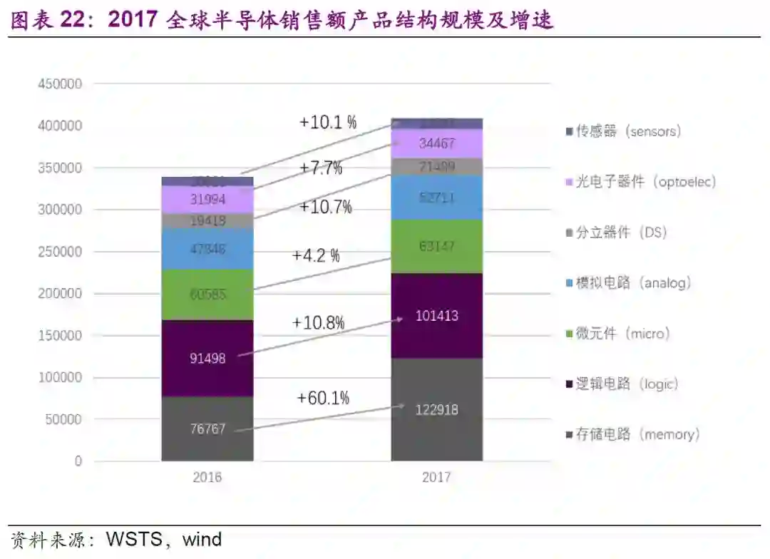据WSTS数据,2017年世界半导体市场规模为4086.91亿美元,同比增长20.6%,首破4000亿美元大关,创七年以来(2010年为年增31.8%)的新高。