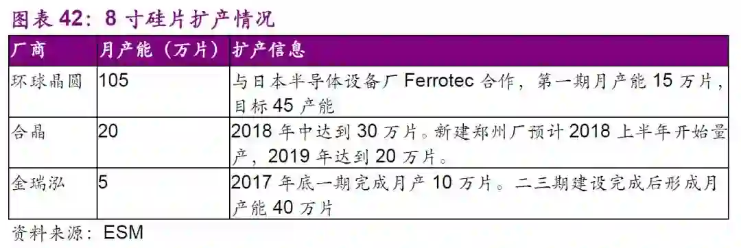涨价:2017年12英寸硅晶圆供不应求且价格逐季调涨,8英寸硅晶圆价格也在2017年下半年跟涨,累计涨幅约10%。在投片需求持续增加,但扩产有限下,预期2018年上半年8寸晶圆厂产能整体产能仍吃紧。根据ESM报道,预期随着硅晶圆续涨价,预计2018年第1季8寸晶圆代工价格将会调涨5~10%。