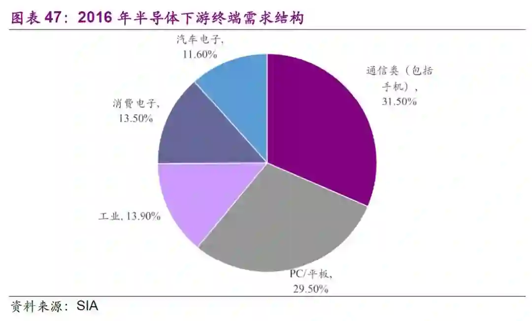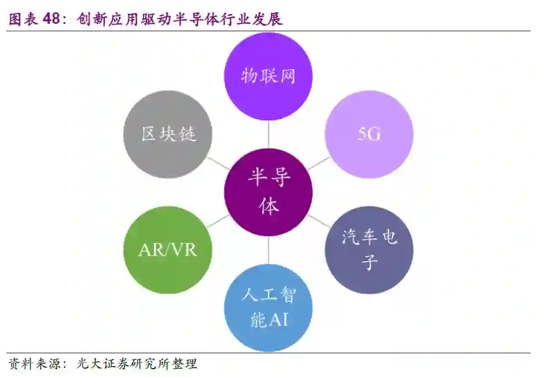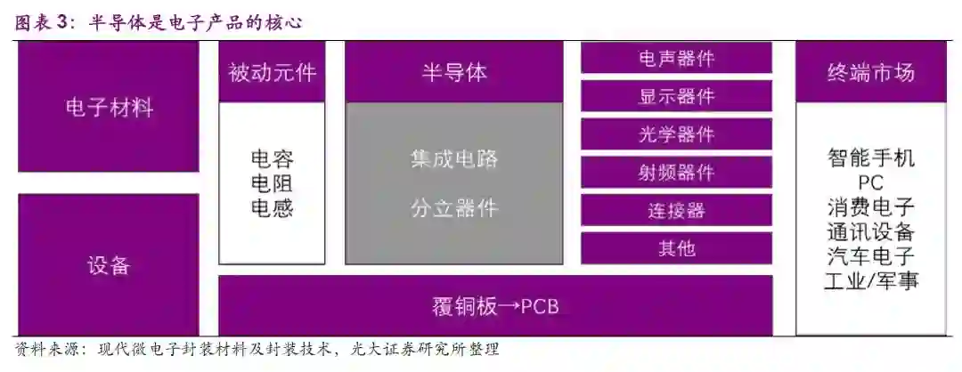 半导体位于电子行业的中游,上游是电子材料和设备。半导体和被动元件以及模组器件通过集成电路板连接,构成了智能手机、PC等电子产品的核心部件,承担信息的载体和传输功能,成为信息化社会的基石。