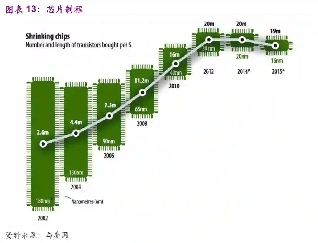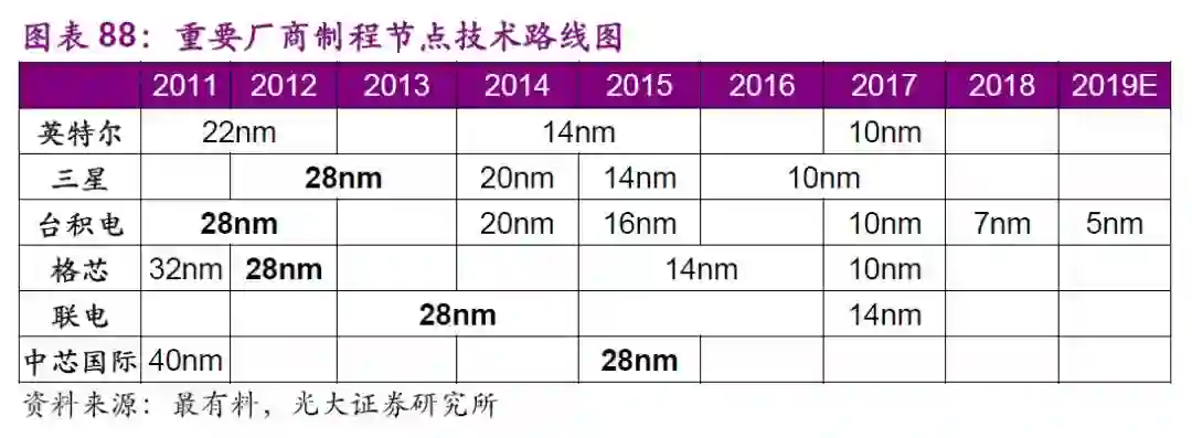芯片的制程就是用来表征集成电路尺寸的大小的一个参数,随着摩尔定律发展,制程从0.5微米、0.35微米、0.25微米、0.18微米、0.15微米、0.13微米、90纳米、65纳米、45纳米、32纳米、28纳米、22纳米、14纳米,一直发展到现在的10纳米、7纳米、5纳米。目前,28nm是传统制程和先进制程的分界点。