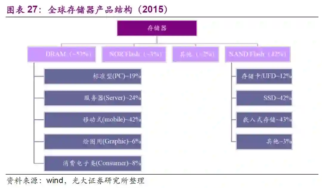 存储器主要包括DRAM、NANDFlash和NORFlash。其中DRAM约占存储器市场53%,NANDFlash约占存储器市场42%,而NORFlash仅占3%左右。DRAM即通常所说的运行内存,根据下游需求不同主要分为:标准型(PC)、服务器(Server)、移动式(mobile)、绘图用(Graphic)和消费电子类(Consumer)。NANDFlash即通常所说的闪存,根据下游需求不同主要分为:存储卡/UFD、SSD、嵌入式存储和其他。