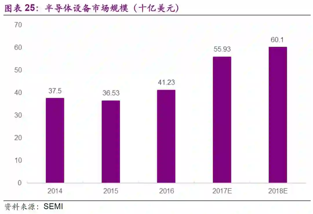 半导体带动上游设备创历史新高。据SEMI预测,2017年半导体设备的销售额为559亿美元,比2016年增长35.6%。2018年,半导体设备的销售额达到601亿美元,比2017年增长7.5%。