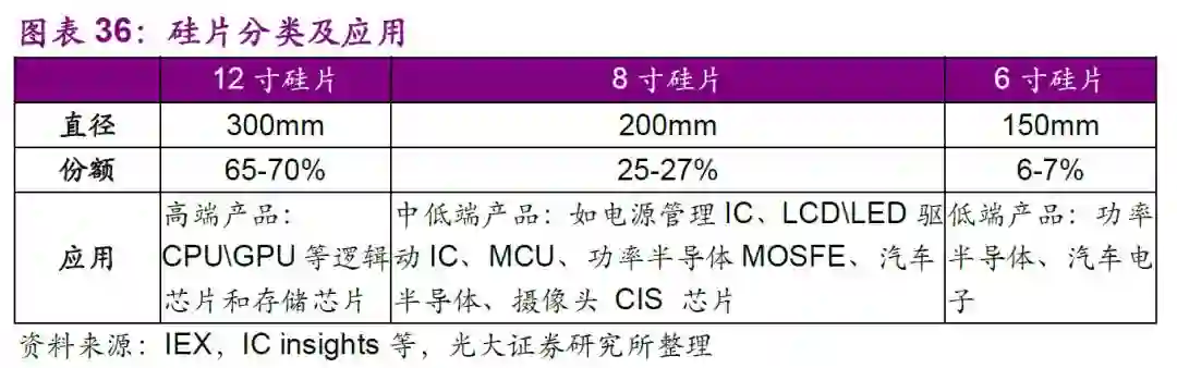 12英寸硅片主要用于高端产品,如CPUGPU等逻辑芯片和存储芯片;8英寸主要用于中低端产品,如电源管理IC、LCDLED驱动IC、MCU、功率半导体MOSFE、汽车半导体等。