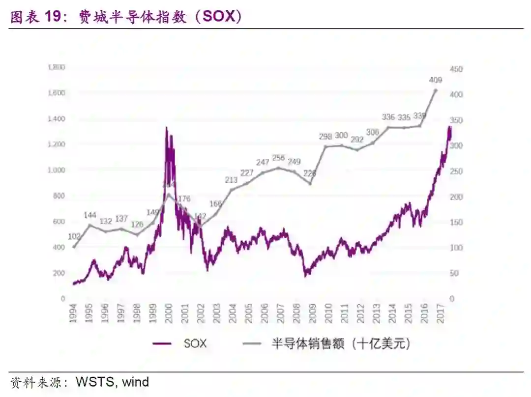 费城半导体指数(SOX)由费城交易所创立于1993年,有20家企业的股票被列入该指数,为全球半导体业景气主要指标之一,其走势与全球半导体销售额的走势基本相同。
