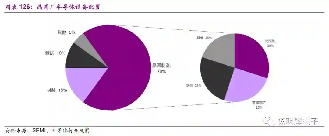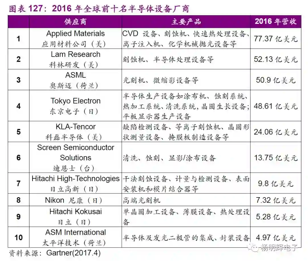 荷兰ASML几乎垄断了高端领域的光刻机,市场份额高达80%。ASML新出的EUV光刻机可用于试产7nm制程,价格高达1亿美元。AMAT在CVD设备和PVD设备领域都保持领先,LamResearch是刻蚀机设备领域龙头。