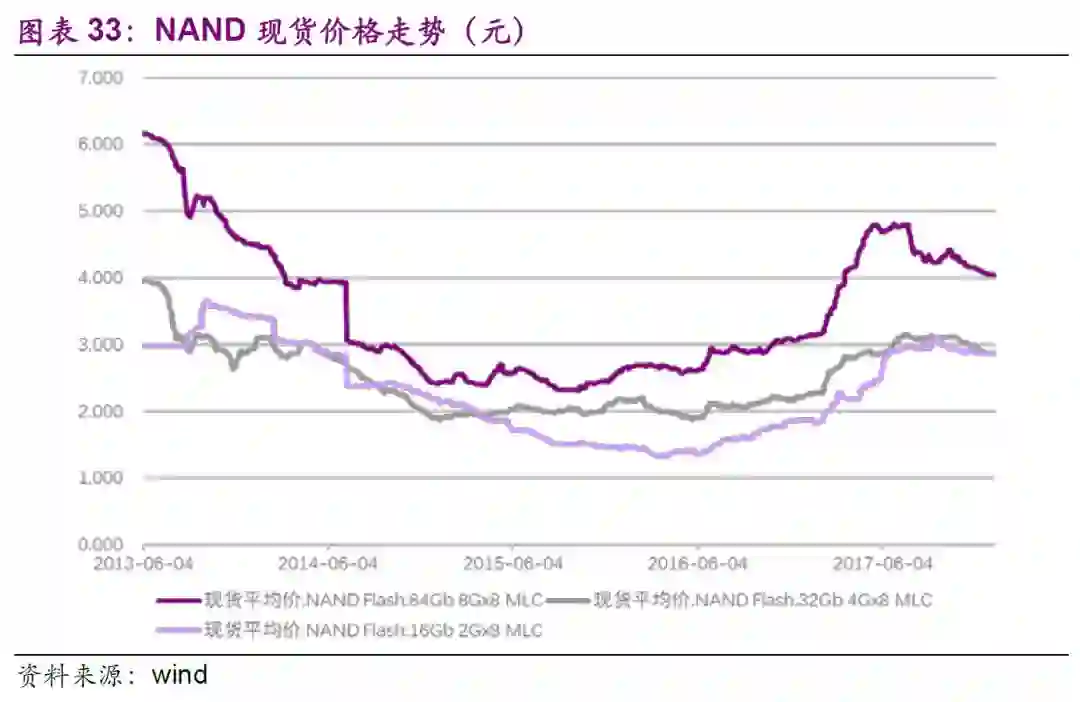需求端:下游智能手机闪存存不断从16G到32G、64G、128G甚至256G升级导致嵌入式存储快速需求增长,同时随着SSD在PC中渗透率提升导致SSD需求快速增长。