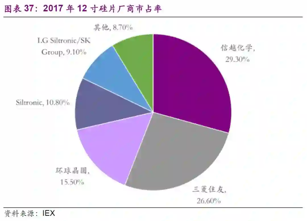 硅片供给属于寡头垄断市场,目前全球硅晶圆厂商以日本、台湾、德国等五大厂商为主,包括日本信越、日本三菱住友SUMCO、环球晶圆、德国Siltronic、韩国SKSiltronic,前五大供应商囊括约90%以上的市场份额。