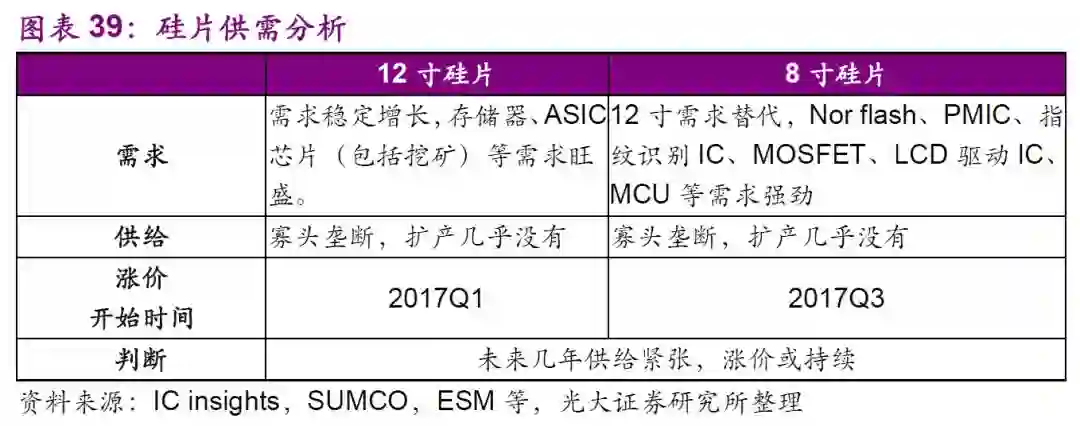 供给端:8寸晶圆制造设备产能持续降低,部份关键设备出现严重缺货,二手8寸晶圆制造设备也是供不应求。在此情况下,晶圆代工短期厂很难大举扩增8寸晶圆产能,8寸硅晶圆的扩产需到2018年-2019年才有产出,我们预计未来几年8寸硅片也将处于供给紧张状态。