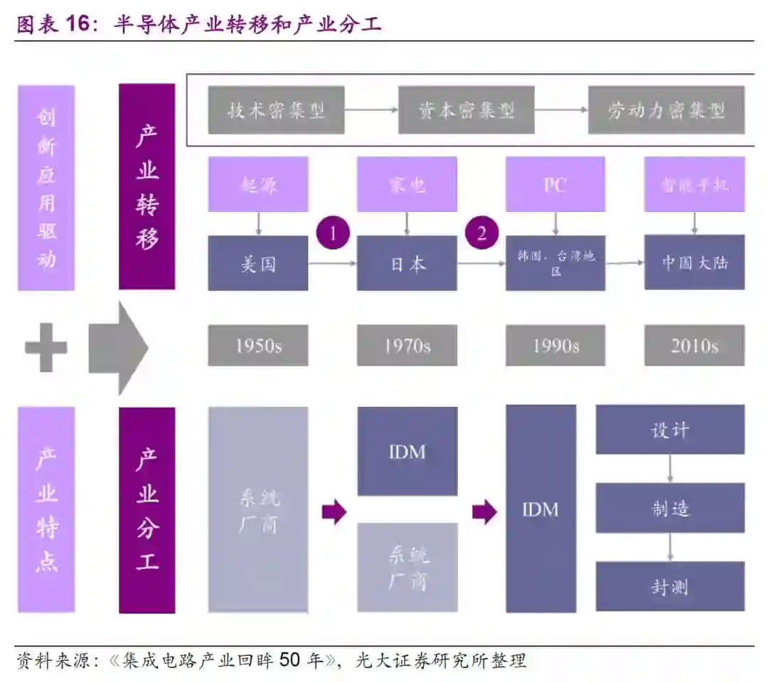 半导体行业因具有下游应用广泛,生产技术工序多、产品种类多、技术更新换代快、投资高风险大等特点,叠加下游应用市场的不断兴起,半导体产业链从集成化到垂直化分工越来越明确,并经历了两次空间上的产业转移。
