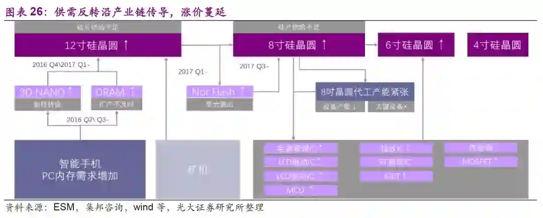 本轮涨价的根本原因为供需反转,并沿产业链传导,从存储器中DRAM和NAND供不应求涨价导致上游12寸硅片供不应求涨价,12寸晶圆代工厂涨价,NOR涨价,12寸硅片不足用8寸硅片代替,导致8寸硅片涨价,8寸晶圆代工厂涨价,传导下游电源管理IC、LCD/LED驱动IC、MCU、功率半导体MOSFET等涨价,涨价持续蔓延。此外,2017Q4加密币挖矿芯片半路杀出抢12寸晶圆先进制程产能。