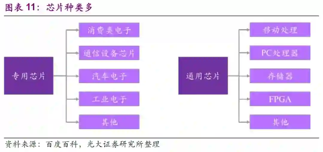 产品种类多。从技术复杂度和应用广度来看,集成电路主要可以分为高端通用和专用集成电路两大类。高端通用集成电路的技术复杂度高、标准统一、通用性强,具有量大面广的特征。它主要包括处理器、存储器,以及FPGA(现场可编程门阵列)、AD/DA(模数/数模转换)等。专用集成电路是针对特定系统需求设计的集成电路,通用性不强。每种专用集成电路都属于一类细分市场,例如,通信设备需要高频大容量数据交换芯片等专用芯片;汽车电子需要辅助驾驶系统芯片、视觉传感和图像处理芯片,以及未来的无人驾驶芯片等。