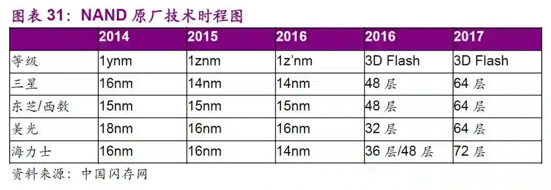 供给端:2016和2017年为NANDFlash从2D到3DNAND制程转化年,产能存在逐渐释放的过程,主要厂商有三星、东芝、美光和海力士,三星同样是产业龙头,市占率约为37%。