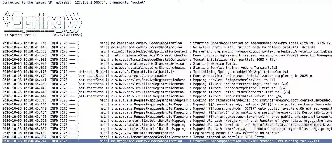 最后一步就是要验证结果了。运行 CoderXApplication 类的 main 方法启动服务。启动成功的话,会打印出如下消息: